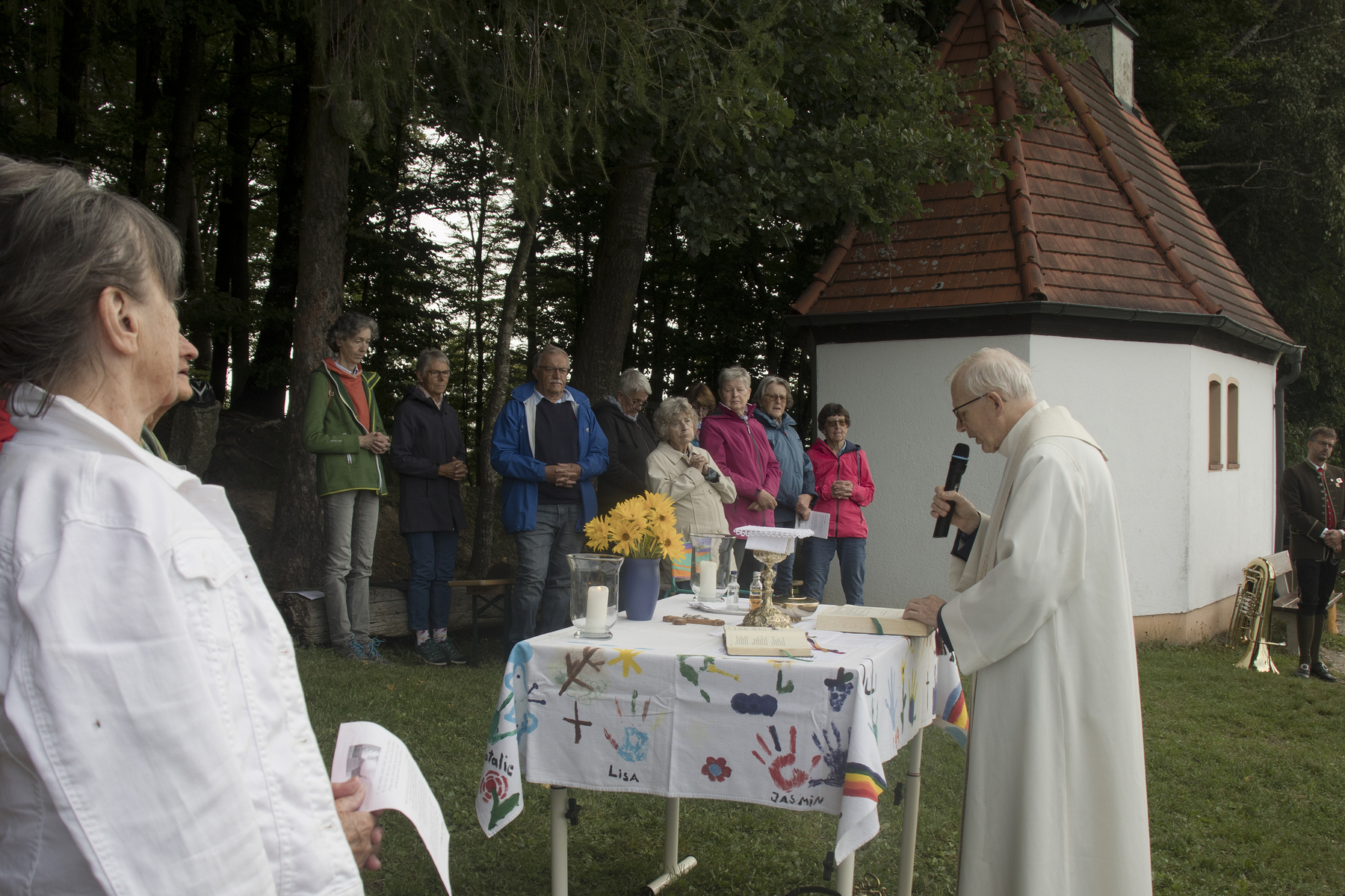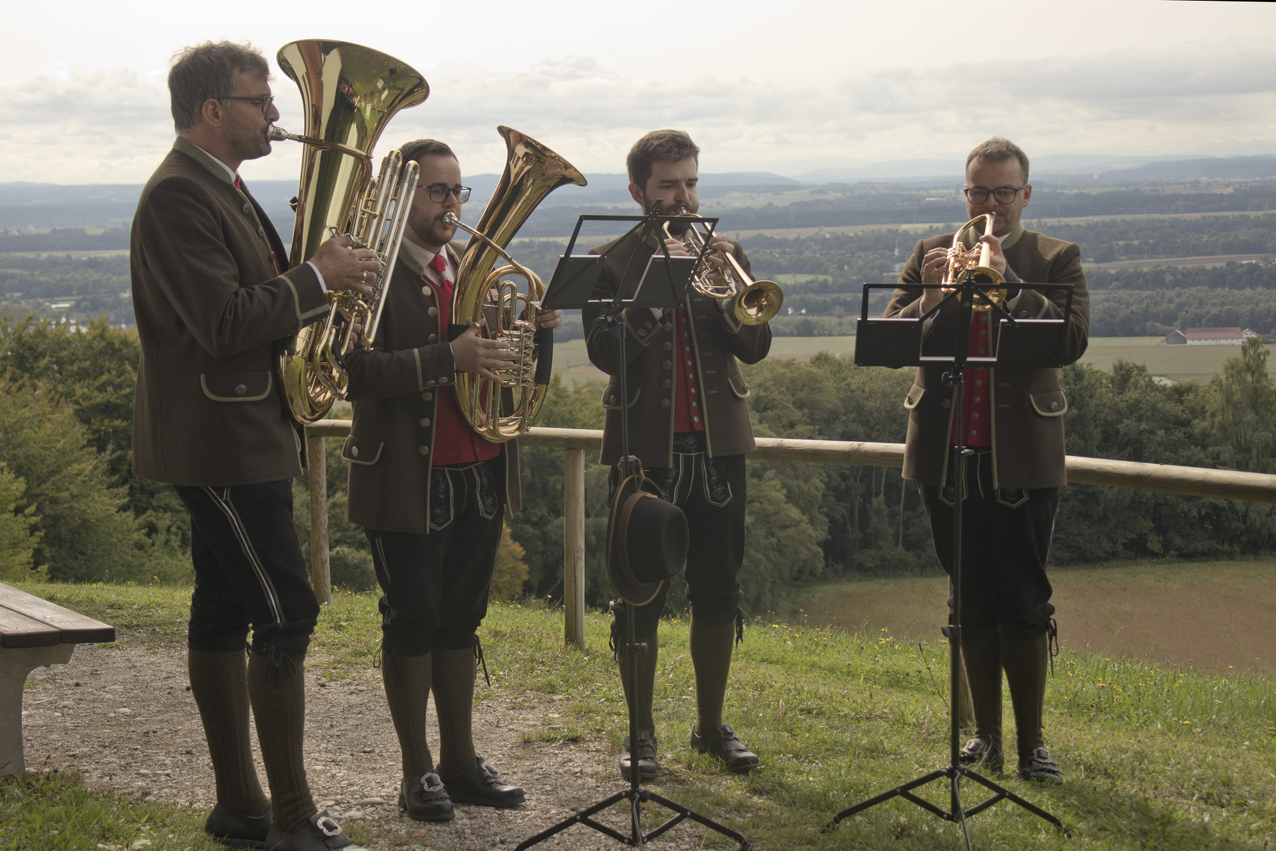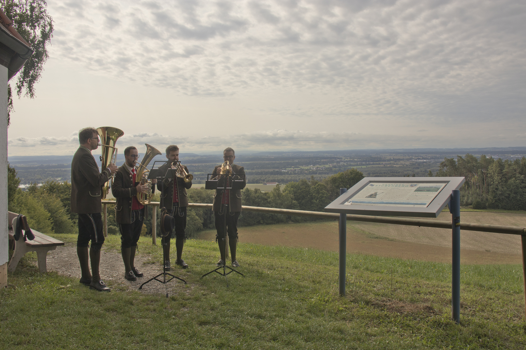 Trotz der starken Konkurrenz einer anderen "Messe" (Ausstellung) und diverser anderer Veranstaltungen waren doch ca. 80 Personen zur Kapelle Bertenöd an einen der schönsten Aussichtsplätze rund um Braunau zur Bergmesse gekommen. Da sich in der näheren österreichischen Umgebung von Braunau keine Aussichtsberge befinden, wird jedes Jahr den bayrischen Nachbarn, die sich gerne zum Mitfeiern einfinden, zur Feier der Bergmesse ein Besuch abgestattet. Herr Josef Pollhammer, der seit 1. September als Kurat in der Pfarre Braunau tätig ist, feierte die Hl. Messe mit den "Berggehern", die zu Fuß, per Rad oder Auto gekommen waren. Für die festlich-feierliche Stimmung sorgte ein vierköpfiges Bläser-Ensemble der Stadtkapelle Braunau.