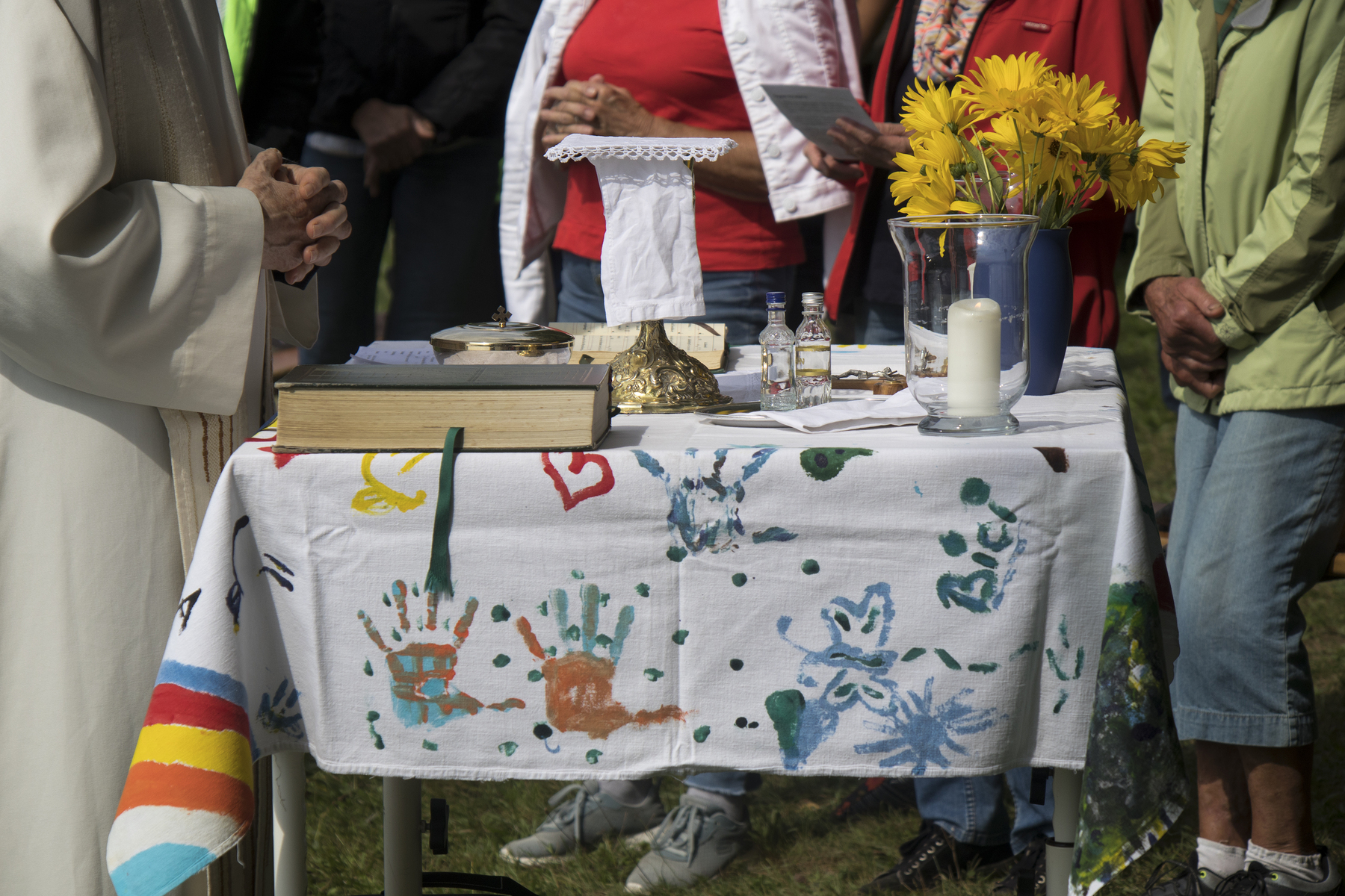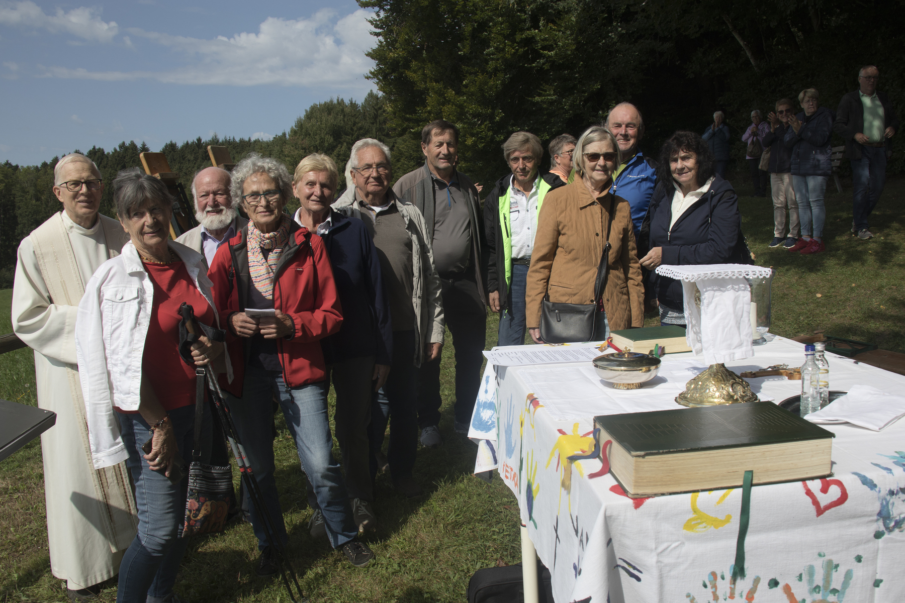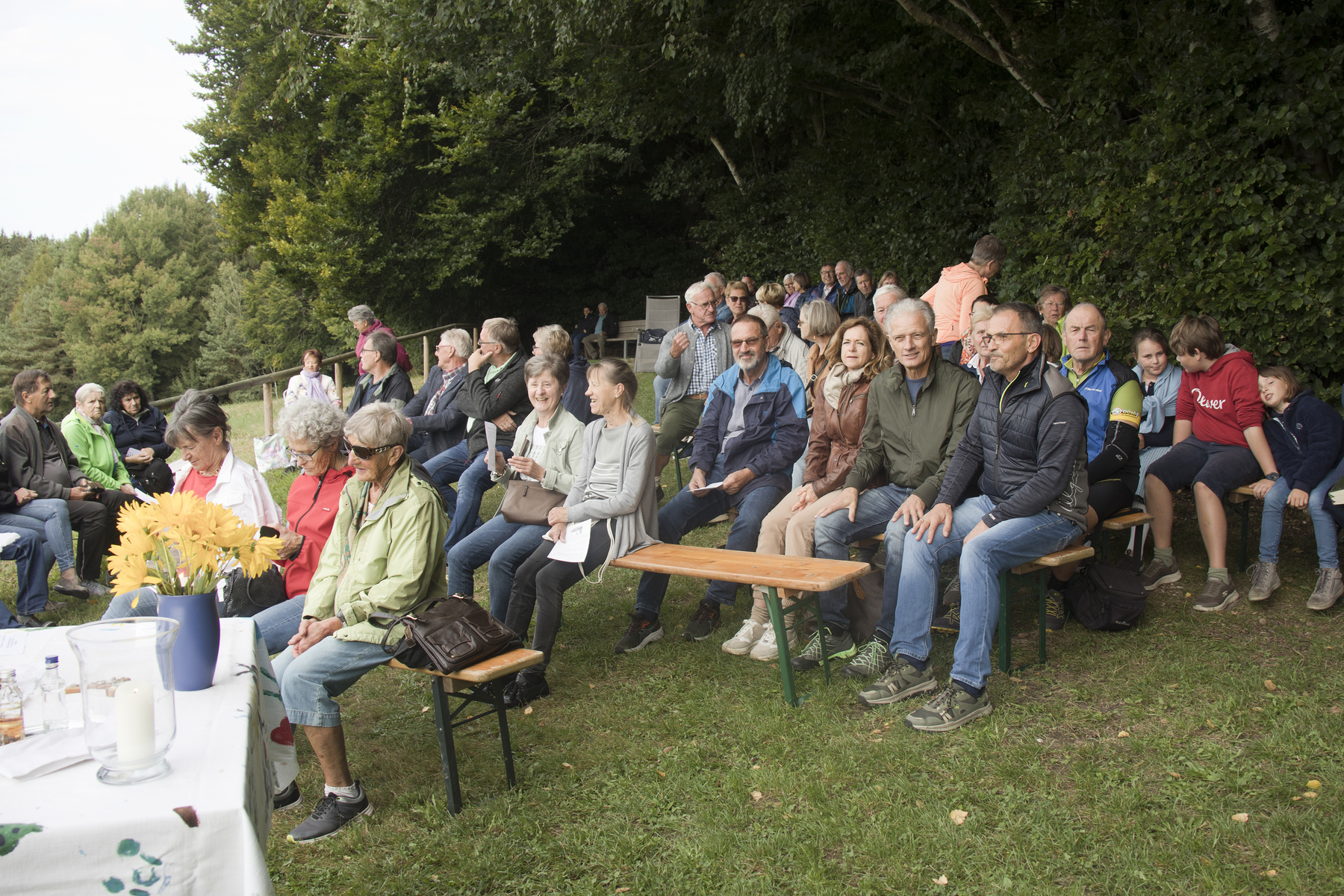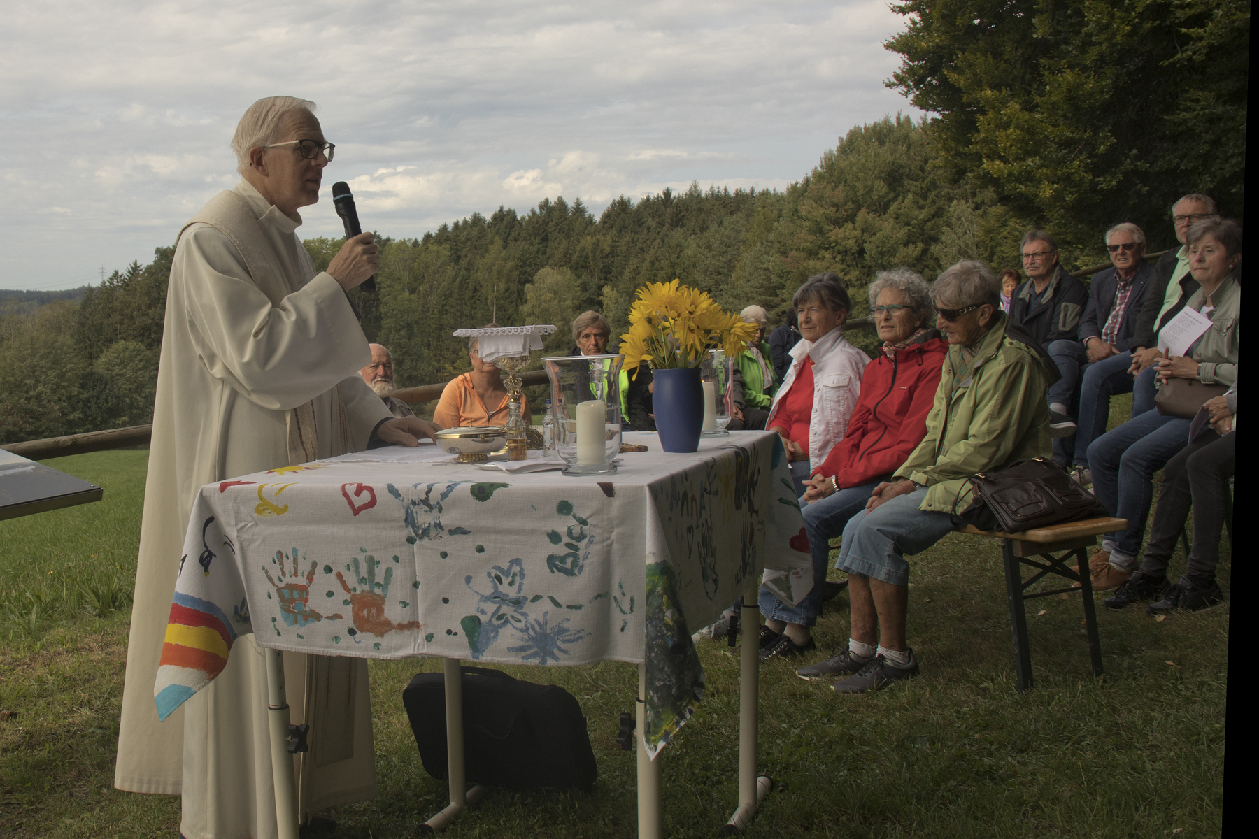 Trotz der starken Konkurrenz einer anderen "Messe" (Ausstellung) und diverser anderer Veranstaltungen waren doch ca. 80 Personen zur Kapelle Bertenöd an einen der schönsten Aussichtsplätze rund um Braunau zur Bergmesse gekommen. Da sich in der näheren österreichischen Umgebung von Braunau keine Aussichtsberge befinden, wird jedes Jahr den bayrischen Nachbarn, die sich gerne zum Mitfeiern einfinden, zur Feier der Bergmesse ein Besuch abgestattet. Herr Josef Pollhammer, der seit 1. September als Kurat in der Pfarre Braunau tätig ist, feierte die Hl. Messe mit den "Berggehern", die zu Fuß, per Rad oder Auto gekommen waren. Für die festlich-feierliche Stimmung sorgte ein vierköpfiges Bläser-Ensemble der Stadtkapelle Braunau.
