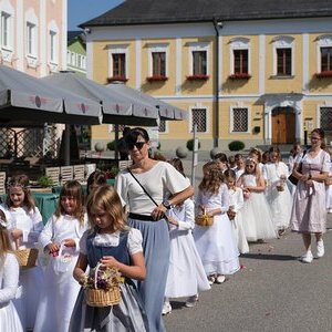 Bei der Prozession wird dann die Monstranz vom Priester unter dem Himmel getragen. Eine Monstranz ist ein kostbares, mit Gold gestaltetes liturgisches Schaugefäß mit einem Fensterbereich. In diesem wird eine konsekrierte Hostie, das Allerheiligste, zur Verehrung und Anbetung feierlich gezeigt. In unserer Pfarre wird die Monstranz zu Fronleichnam noch mit einem Kranz aus Blumen schön geschmückt.