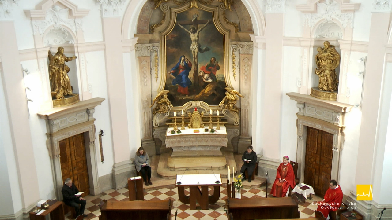 Wie alle anderen Gottesdienste fand auch der TV-Gottesdienst in der Linzer Priesterseminarkirche „unter Pandemie-Bedingungen“ statt: in kleinster Besetzung und unter Ausschluss der Öffentlichkeit. Mit Bischof Manfred Scheuer feierten am Palmsonntag, 5. April um 10 Uhr in der Linzer Priesterseminarkirche Diakon Anton Birngruber, die Lektorin Cosima Spieß, Kantorin Schwester Maria Regina Scherrer, Kantor Josef Habringer und Organist Wolfgang Kreuzhuber.