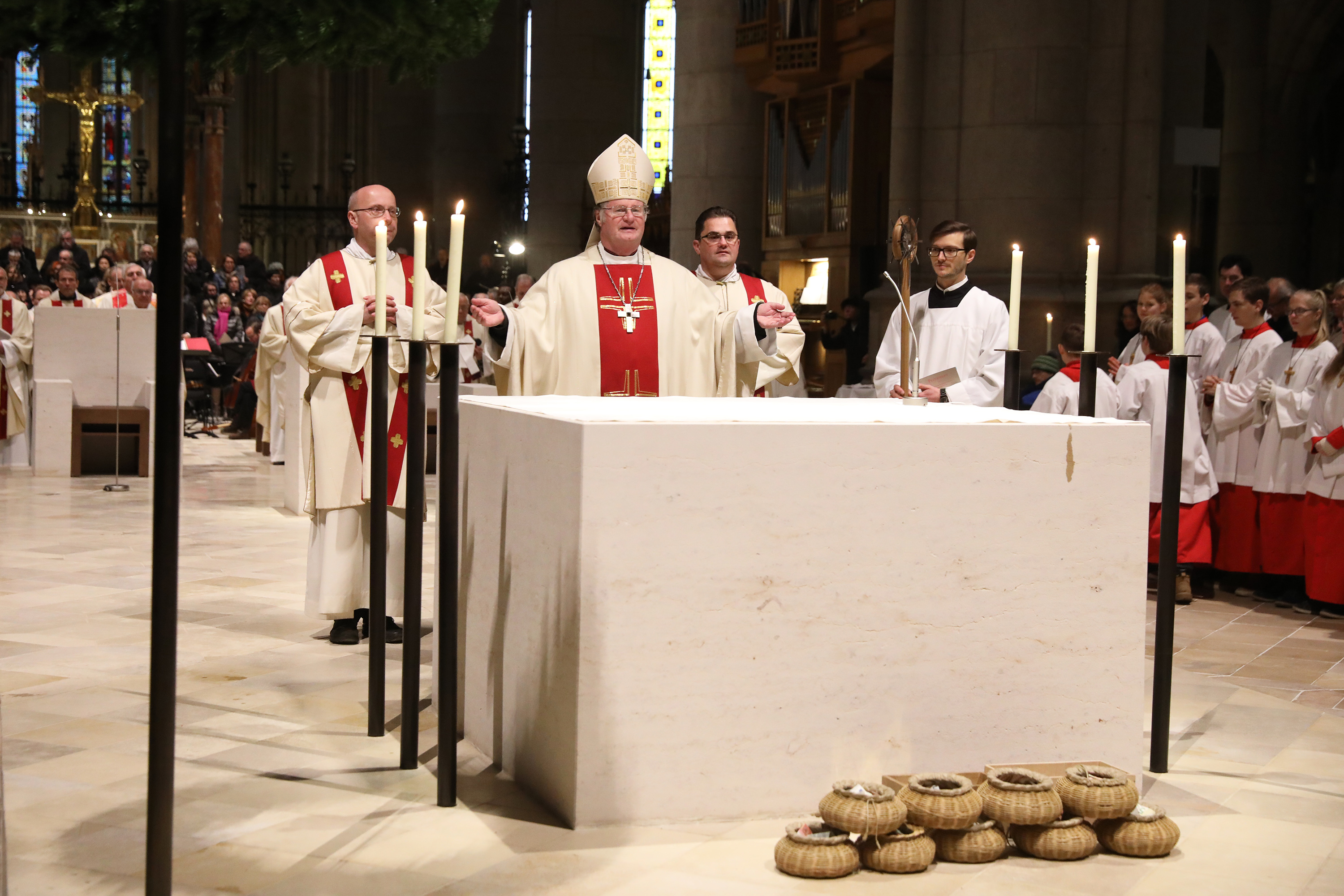 Danach besprengte der Diözesanbischof den Altar mit Weihwasser, das an die Taufe erinnert. An diesem Altar werden die Gläubigen gestärkt und im Glauben genährt. Hierauf salbte Bischof Scheuer die Mensa (Tischplatte) des Altars mit Chrisamöl; durch die Salbung wird der Altar zum sichtbaren Zeichen für das Geheimnis Christi und seiner Kirche („Christus“ bedeutet „der Gesalbte“). Auch hier wird der Bezug zur Taufe sichtbar: Täuflinge werden mit Chrisam gesalbt, als Zeichen für die Zugehörigkeit zu Christus und die damit verbundene „Königs-Würde“. An den Stellen der fünf eingemeißelten Altarkreuze, die für die Wundmale Christi und sein Leiden am Kreuz stehen, verbrannte Bischof Scheuer Weihrauch auf dem Altar. Die Weihrauchkörner, die auf glühende Kohlen gelegt wurden, erinnern an die Lebenshingabe Jesu und bringen gleichzeitig die Bitte der Gläubigen um die Verwandlung des Herzens zu Gott. Danach sprach Bischof Scheuer das Weihegebet, das an die Bedeutung der Altäre in der biblischen Geschichte erinnert und den neu errichteten Altar als Quelle der Liebe und des Segens preist. Schließlich wurden das Altartuch aufgelegt und die Lichter am Altar entzündet. Danach wurden Ambo und Altar hell beleuchtet.